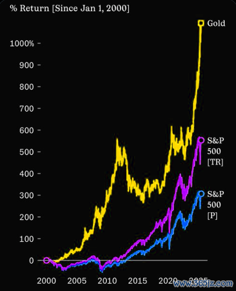 字据Sherwood和Koyfin的数据,黄金在以前25年中跑赢了好意思国股市。
